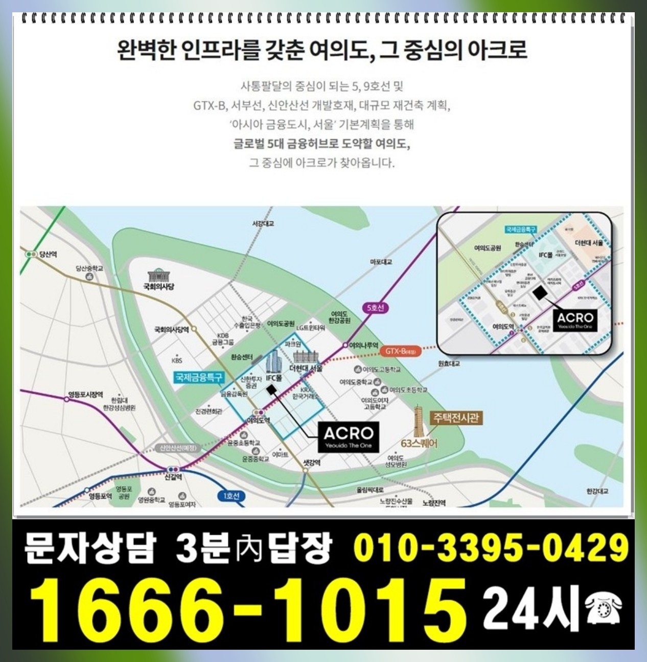 한편, 아크로 여의도 더원 모델하우스는 63스퀘어에 위치했으며, 현재 선착순 호실 지정 및 사전 방문 예약을 진행 중으로 대표번호로 문의 주시기 바랍니다.